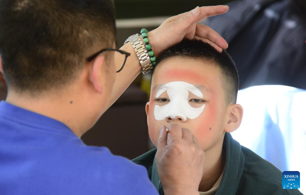 Yang Qiang paints Peking Opera facial makeup on the face of a student in Beijing, capital of China, Jan. 8, 2025. (Xinhua/Li Xin)