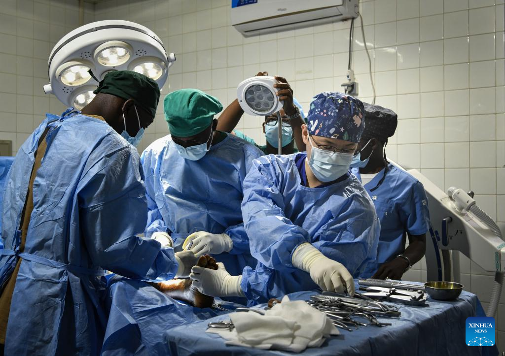 Chinese doctor Ouyang Xunyan, a member of the 20th Chinese medical team to Chad, performs surgery for a patient at the China-Chad Friendship Hospital in N'Djamena, Chad, Jan. 9, 2025. The 20th Chinese medical team to Chad arrived in the country at the end of 2024 and has been providing medical services for local patients and training for local doctors. (Xinhua/Han Xu)