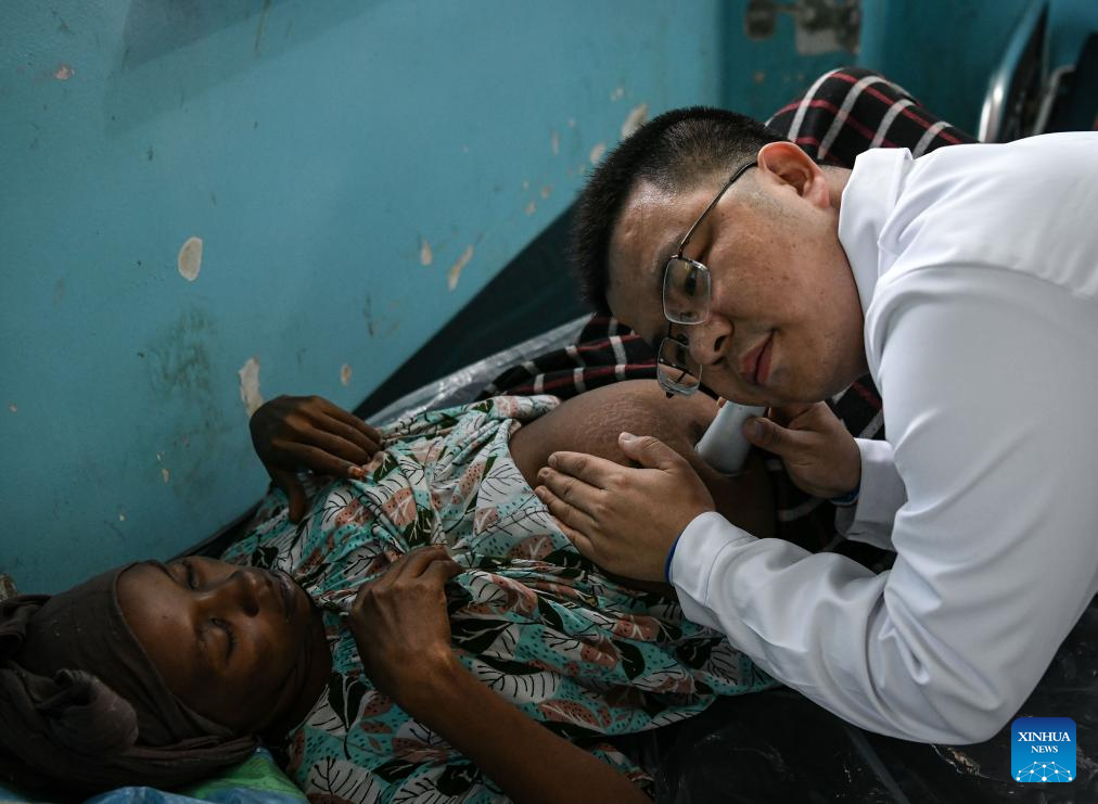 Chinese doctor Yuan Xianping, a member of the 20th Chinese medical team to Chad, examines a pregnant woman at the China-Chad Friendship Hospital in N'Djamena, Chad, Jan. 9, 2025. The 20th Chinese medical team to Chad arrived in the country at the end of 2024 and has been providing medical services for local patients and training for local doctors. (Xinhua/Han Xu)