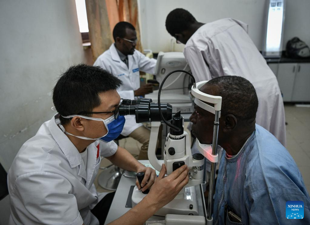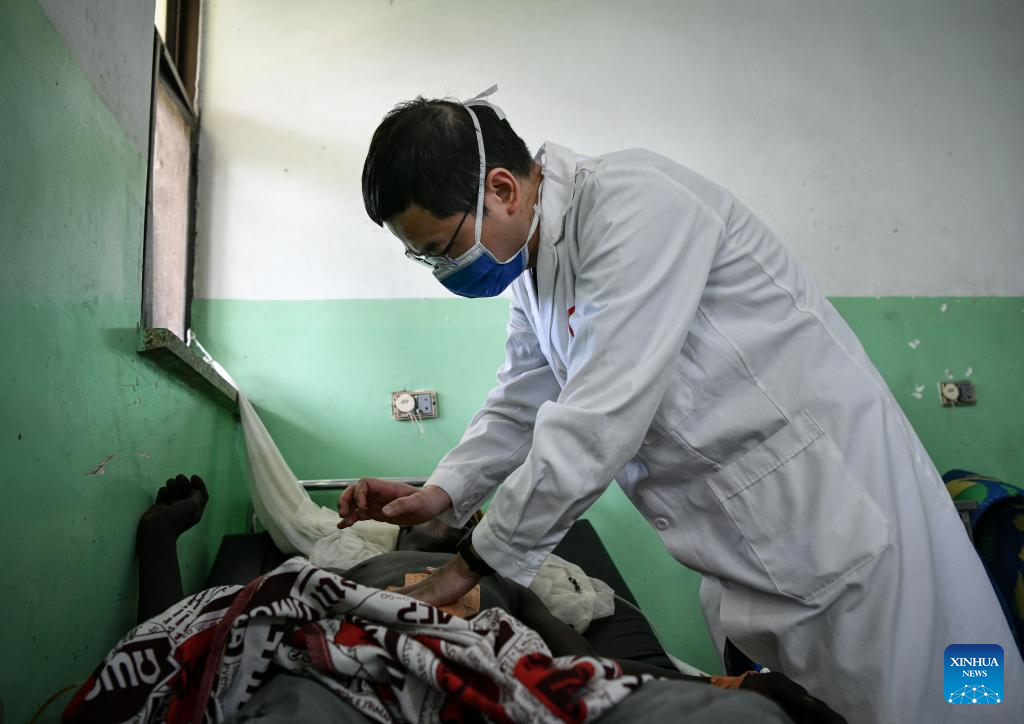 Chinese doctor Zhang Chaozhong, a member of the 20th Chinese medical team to Chad, examines a patient at the China-Chad Friendship Hospital in N'Djamena, Chad, Jan. 9, 2025. The 20th Chinese medical team to Chad arrived in the country at the end of 2024 and has been providing medical services for local patients and training for local doctors. (Xinhua/Han Xu)