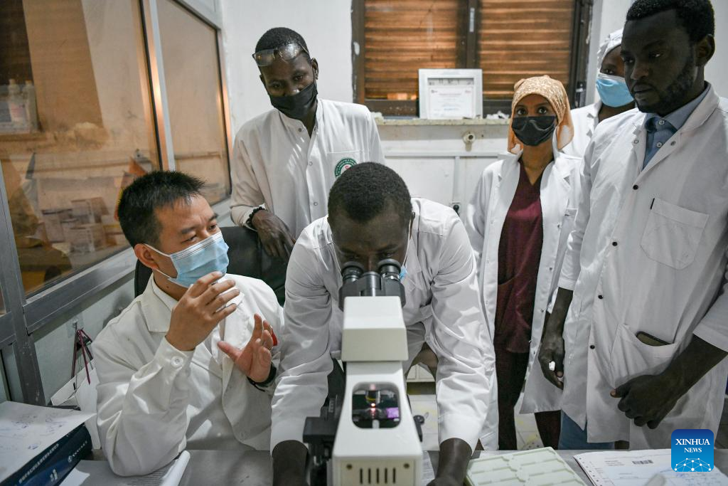 Chinese doctor Wang Zhi, a member of the 20th Chinese medical team to Chad, helps local medical staff with histopathological section diagnosis at the China-Chad Friendship Hospital in N'Djamena, Chad, Jan. 9, 2025. The 20th Chinese medical team to Chad arrived in the country at the end of 2024 and has been providing medical services for local patients and training for local doctors. (Xinhua/Han Xu)