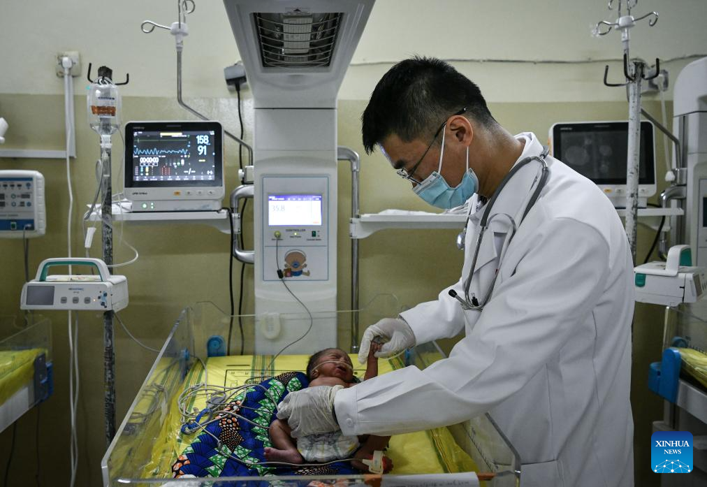 Chinese doctor Xu Kangnan, a member of the 20th Chinese medical team to Chad, examines the condition of a newborn at the China-Chad Friendship Hospital in N'Djamena, Chad, Jan. 9, 2025. The 20th Chinese medical team to Chad arrived in the country at the end of 2024 and has been providing medical services for local patients and training for local doctors. (Xinhua/Han Xu)