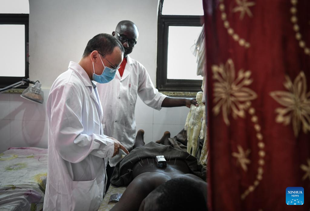 Chinese doctor Xie Nengxiang, a member of the 20th Chinese medical team to Chad, performs acupuncture treatment for a patient at the China-Chad Friendship Hospital in N'Djamena, Chad, Jan. 9, 2025. The 20th Chinese medical team to Chad arrived in the country at the end of 2024 and has been providing medical services for local patients and training for local doctors. (Xinhua/Han Xu)