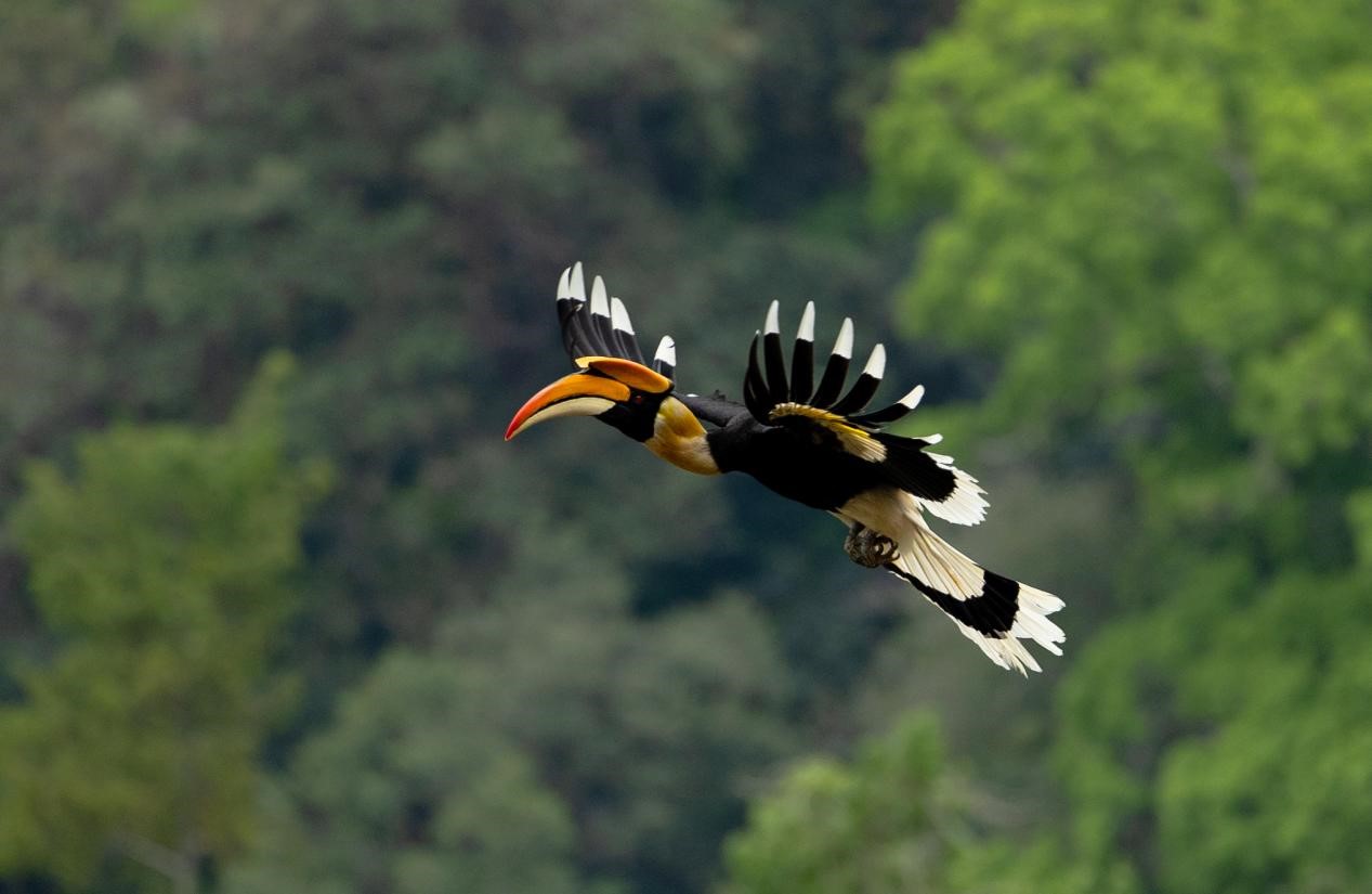 A hornbill flies in the Tongbiguan provincial-level nature reserve in Yingjiang county, Dehong Dai and Jingpo autonomous prefecture, southwest China's Yunnan province. (People's Daily Online/Yang Jialin)