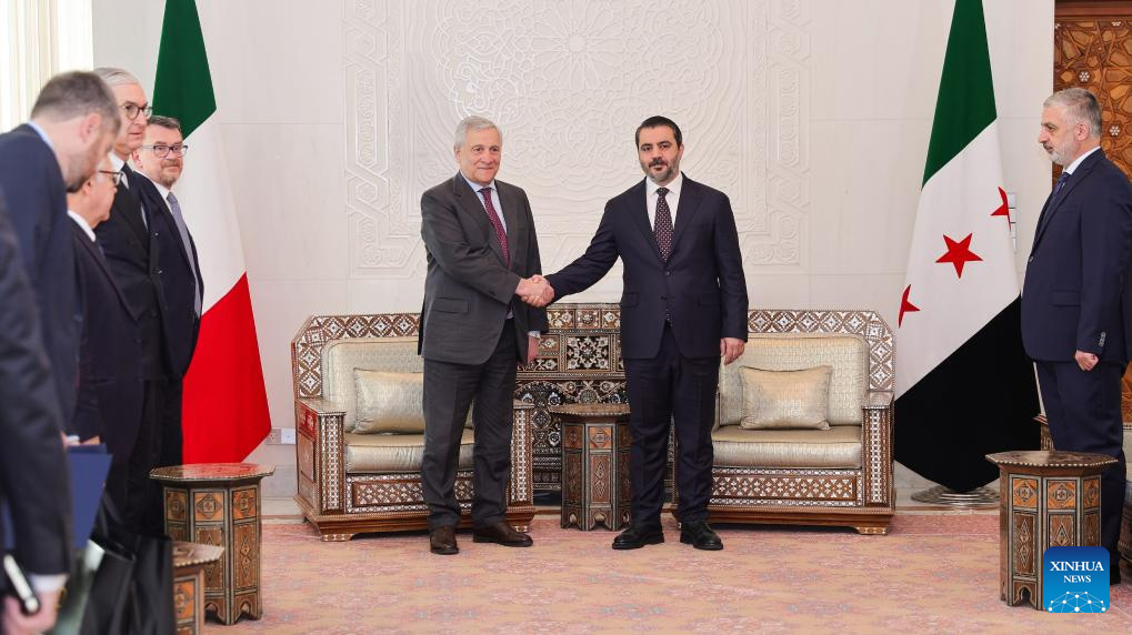 Italian Foreign Minister Antonio Tajani (3rd R) shakes hands with Syria's interim Foreign Minister Asaad Hassan al-Shibani (2nd R) during their meeting in Damascus, Syria, on Jan. 10, 2025. Syria's interim Foreign Minister Asaad Hassan al-Shibani on Friday reaffirmed his government's commitment to guaranteeing freedom for all Syrians, stressing the rule of law and equal citizenship are cornerstones of the nation's future. He made the remarks during a joint press conference in Damascus with visiting Italian Foreign Minister Antonio Tajani. (Syria's interim Foreign Ministry/Handout via Xinhua)