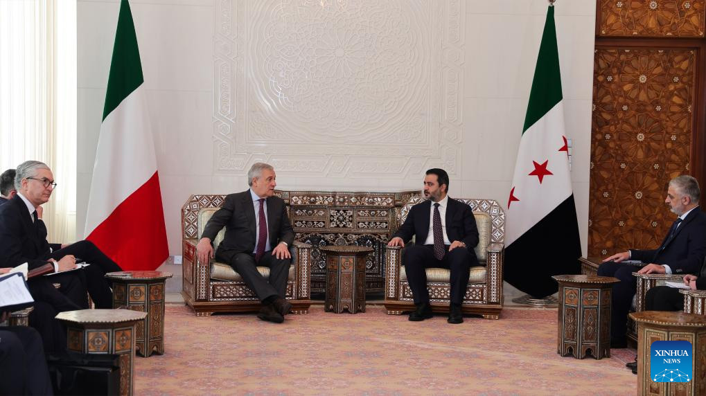Italian Foreign Minister Antonio Tajani (3rd R) meets with Syria's interim Foreign Minister Asaad Hassan al-Shibani (2nd R) in Damascus, Syria, on Jan. 10, 2025. Syria's interim Foreign Minister Asaad Hassan al-Shibani on Friday reaffirmed his government's commitment to guaranteeing freedom for all Syrians, stressing the rule of law and equal citizenship are cornerstones of the nation's future. He made the remarks during a joint press conference in Damascus with visiting Italian Foreign Minister Antonio Tajani. (Syria's interim Foreign Ministry/Handout via Xinhua)