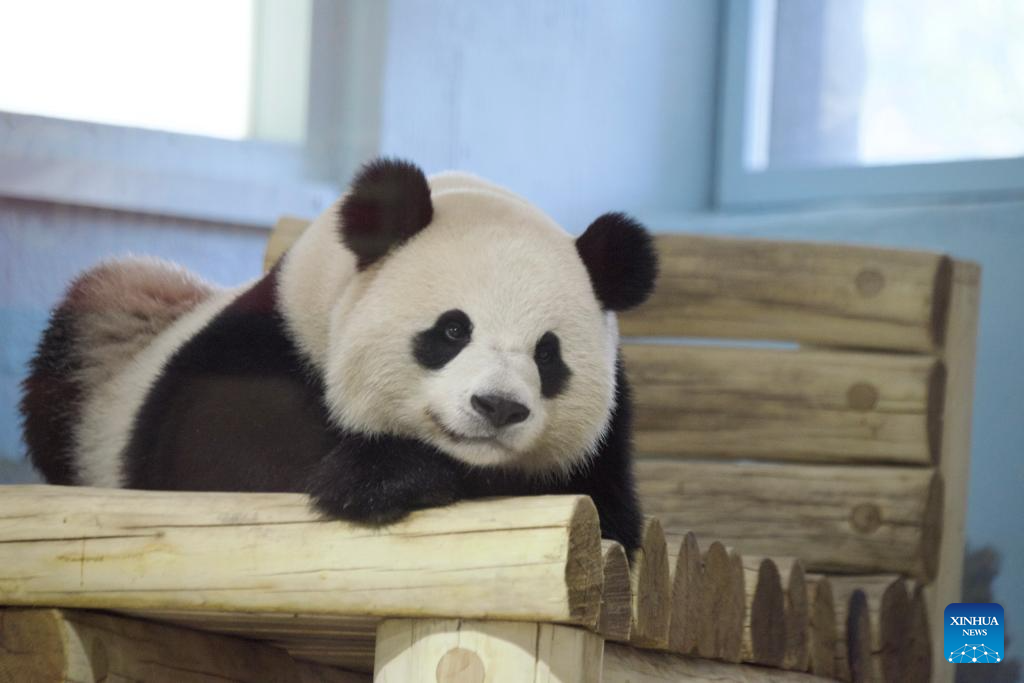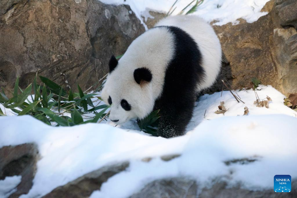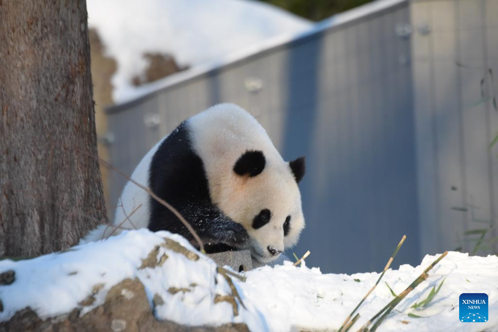 Female giant panda Qing Bao is seen at the Smithsonian's National Zoo in Washington, D.C., the United States, on Jan. 9, 2025. The Smithsonian's National Zoo hosted a media preview event for Chinese media on Friday, where giant pandas Bao Li and Qing Bao made their debut before the press. (Xinhua/Deng Xianlai)