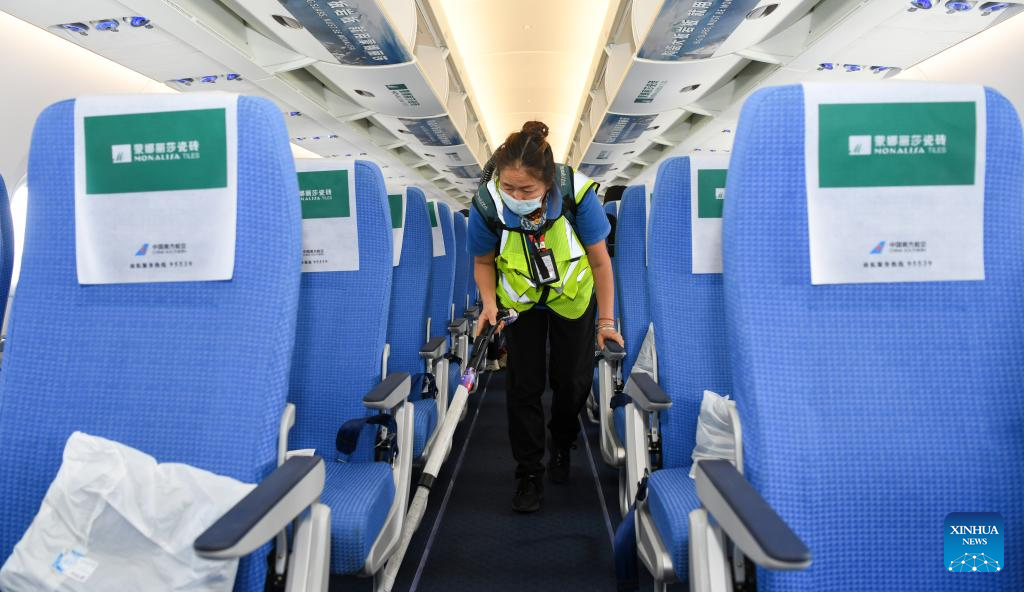 A staff member does cleaning on a C919 jetliner at Sanya Phoenix International Airport in Sanya, south China's Hainan Province, Jan. 10, 2025. A C919 jetliner carrying 112 passengers from Guangzhou, capital of south China's Guangdong Province, landed at Sanya Phoenix International Airport in Hainan Province on Friday, marking the success of this aircraft type's maiden commercial flight in Sanya. (Xinhua/Yang Guanyu)