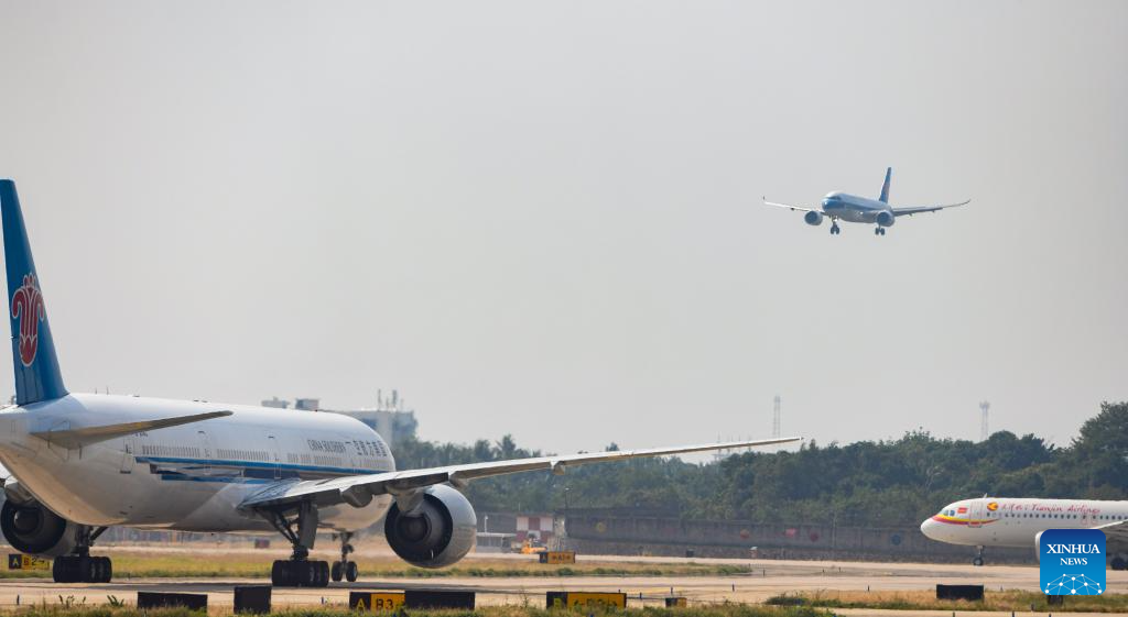 A C919 jetliner prepares to land at Sanya Phoenix International Airport in Sanya, south China's Hainan Province, Jan. 10, 2025. A C919 jetliner carrying 112 passengers from Guangzhou, capital of south China's Guangdong Province, landed at Sanya Phoenix International Airport in Hainan Province on Friday, marking the success of this aircraft type's maiden commercial flight in Sanya. (Xinhua/Yang Guanyu)
