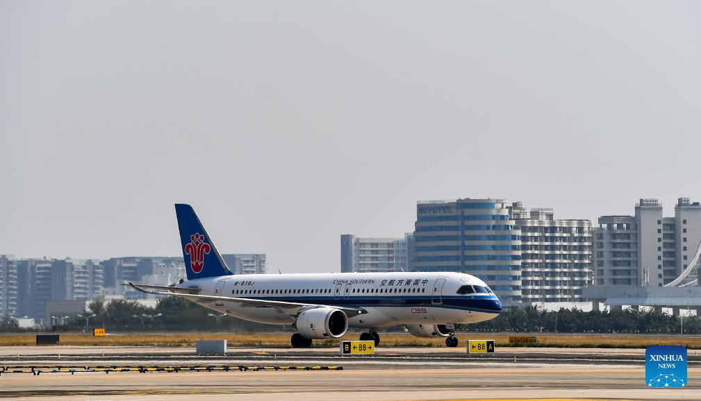 A C919 jetliner taxies on the runway of Sanya Phoenix International Airport in Sanya, south China's Hainan Province, Jan. 10, 2025. A C919 jetliner carrying 112 passengers from Guangzhou, capital of south China's Guangdong Province, landed at Sanya Phoenix International Airport in Hainan Province on Friday, marking the success of this aircraft type's maiden commercial flight in Sanya. (Xinhua/Yang Guanyu)