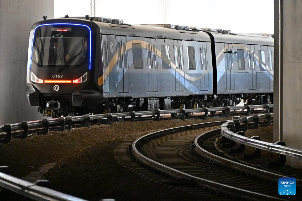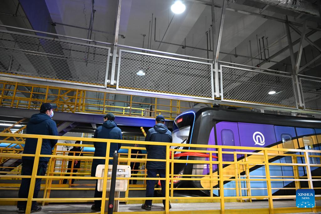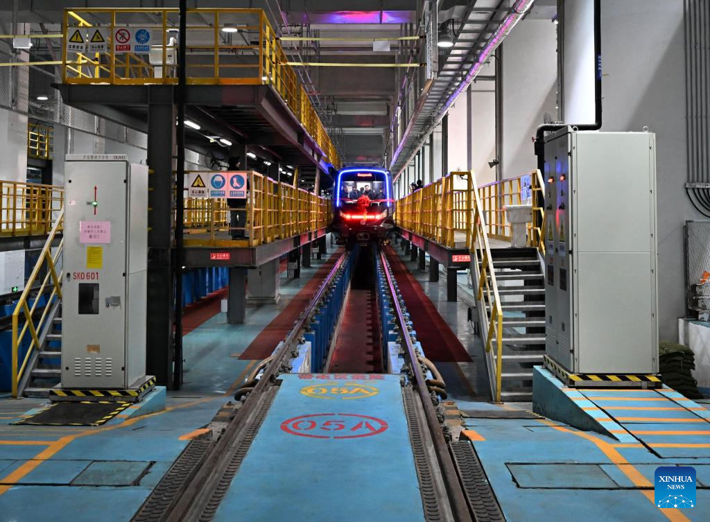 A CETROVO 1.0 metro train leaves a parking lot before its operation in Qingdao, east China's Shandong Province, Jan. 10, 2025. The CETROVO 1.0 subway car started its operation on the Qingdao Metro Line 1 on Friday.