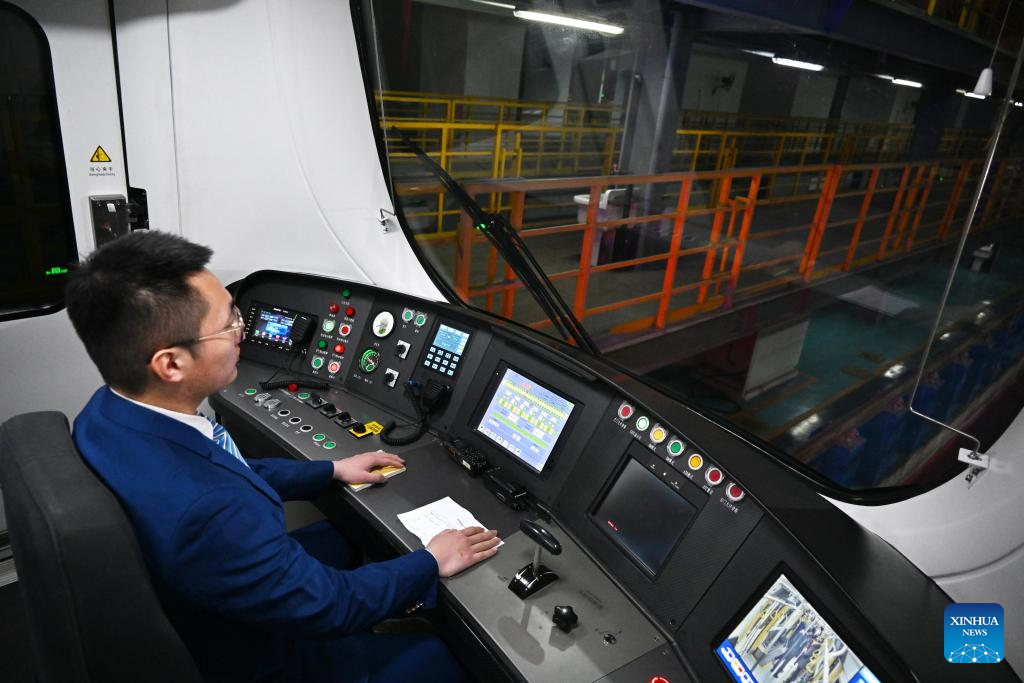 A driver is pictured at the driving cabin of a CETROVO 1.0 metro train before its operation in Qingdao, east China's Shandong Province, Jan. 10, 2025. The CETROVO 1.0 subway car started its operation on the Qingdao Metro Line 1 on Friday.