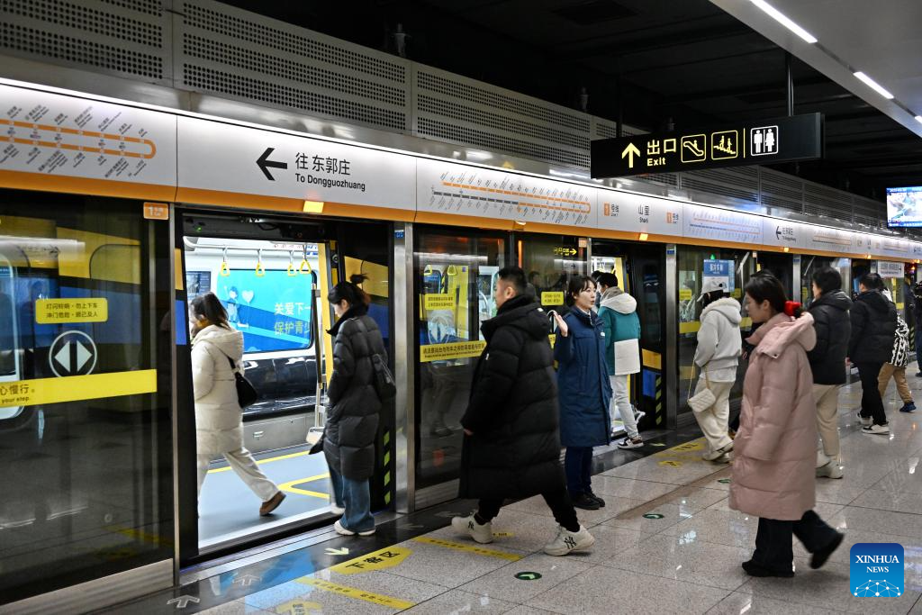 Passengers board a CETROVO 1.0 metro train on the Metro Line 1 in Qingdao, east China's Shandong Province, Jan. 10, 2025. The CETROVO 1.0 subway car started its operation on the Qingdao Metro Line 1 on Friday.