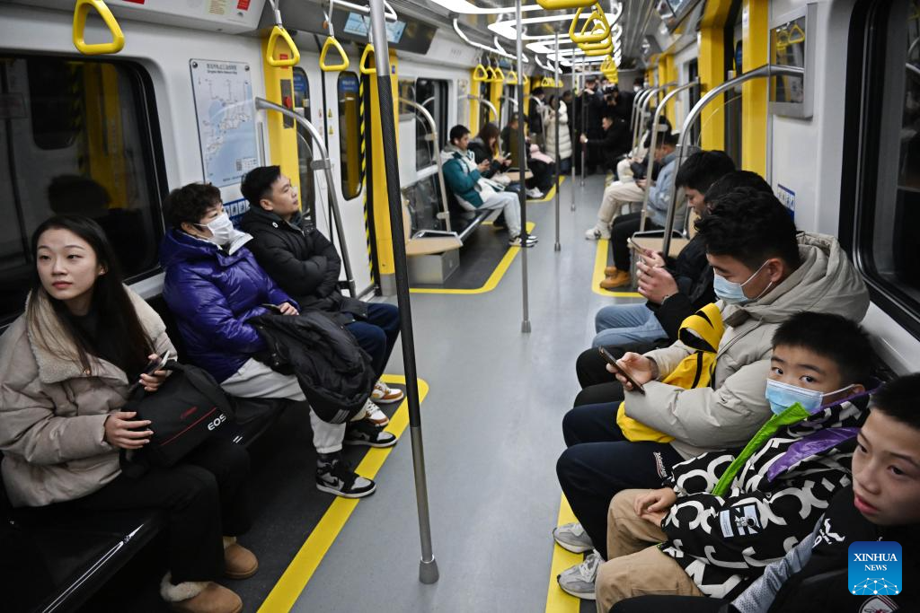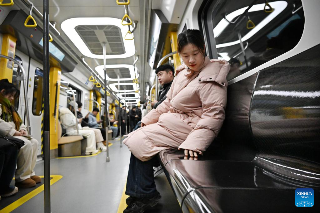 Passengers take a CETROVO 1.0 metro train on the Metro Line 1 in Qingdao, east China's Shandong Province, Jan. 10, 2025. The CETROVO 1.0 subway car started its operation on the Qingdao Metro Line 1 on Friday.