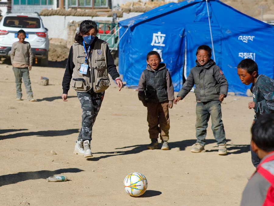 Tan Xiren plays football with children at a temporary settlement for quake-affected people in Cuoang Village of Qulho Township in Dingri County in Xigaze, southwest China's Xizang Autonomous Region, Jan. 11, 2025. (Xinhua/Shen Bohan)