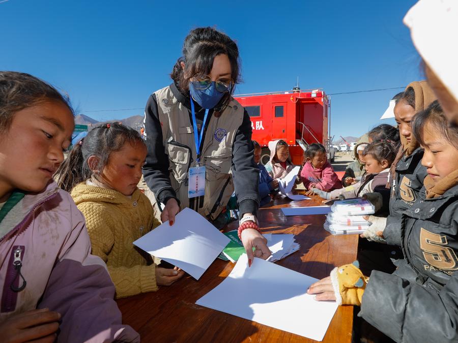 LHASA, Jan. 12 (Xinhua) -- At a resettlement site on Sunday, Tan Xiren handed out paintbrushes, drawing papers and candies to disaster-affected children from the earthquake-struck Qulho Township of Dingri County, southwest China's Xizang Autonomous Region.