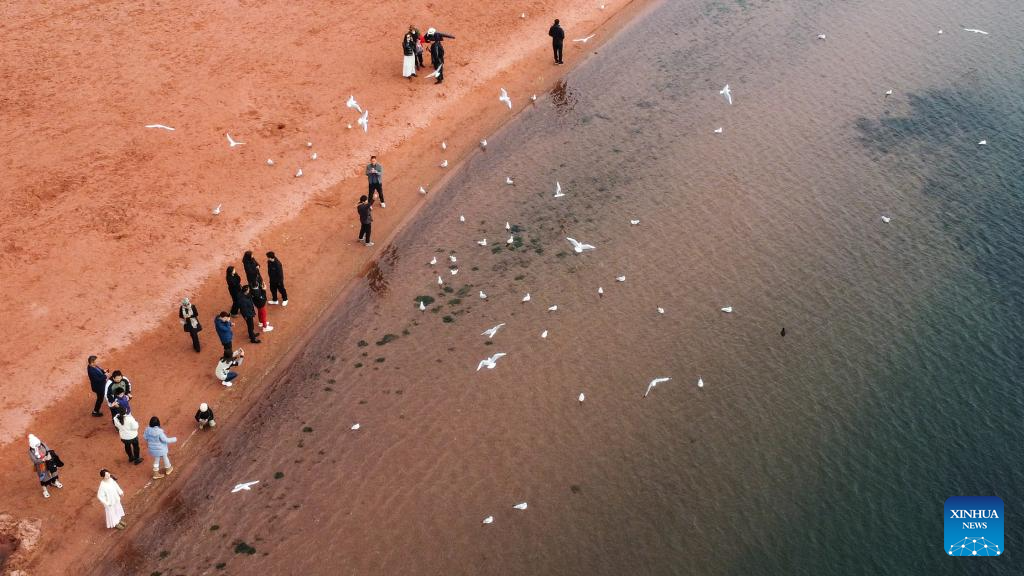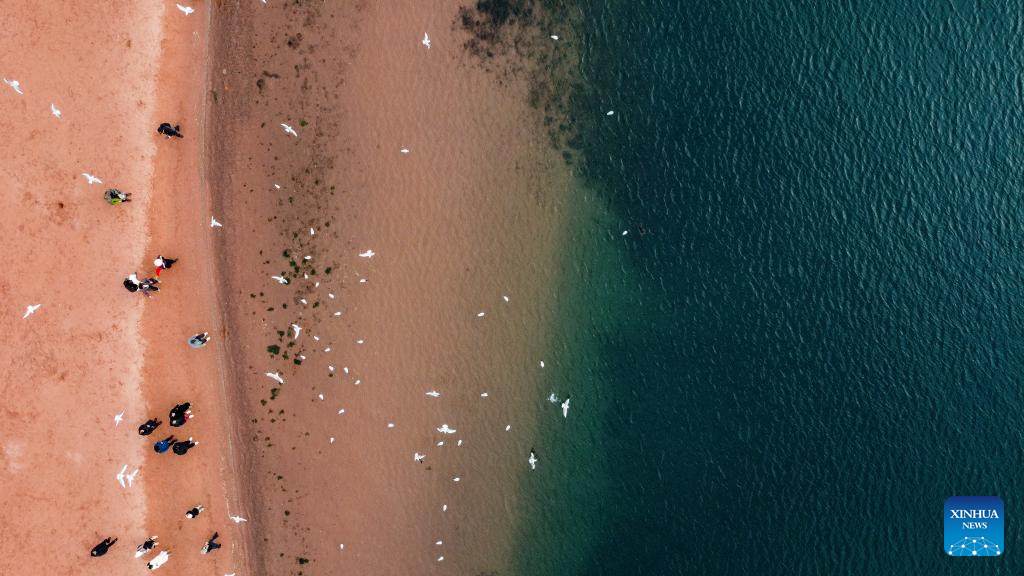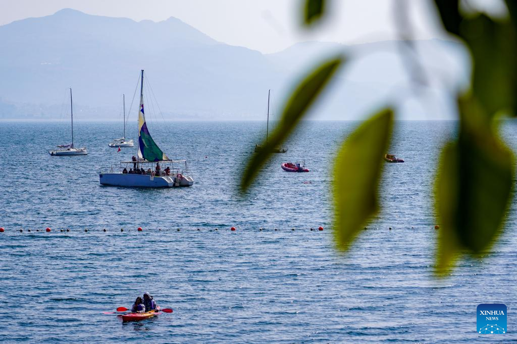 An aerial drone photo shows tourists enjoying themselves by Fuxian Lake in Yuxi City, southwest China's Yunnan Province, Jan. 12, 2025. (Xinhua/Wang Jingyi)