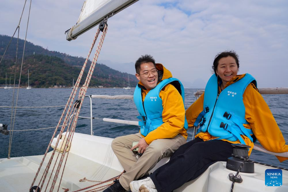 Tourists take a boat on Fuxian Lake in Yuxi City, southwest China's Yunnan Province, Jan. 12, 2025. (Xinhua/Wang Jingyi)