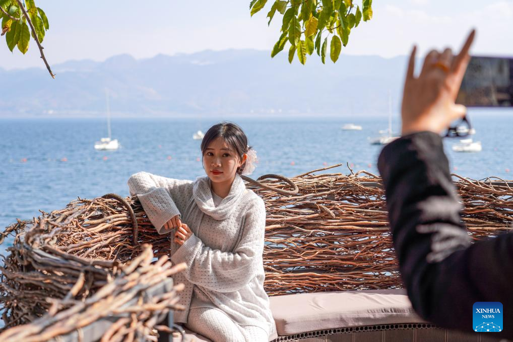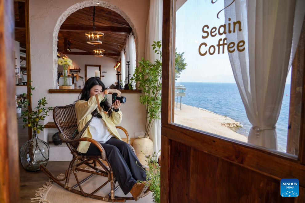 A tourist takes photos at a coffee shop by Fuxian Lake in Yuxi City, southwest China's Yunnan Province, Jan. 12, 2025. (Xinhua/Wang Jingyi)