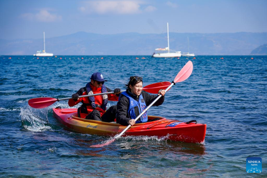 A tourist (R) tries canoe under the guidance of a coach on Fuxian Lake in Yuxi City, southwest China's Yunnan Province, Jan. 12, 2025. (Xinhua/Wang Jingyi)