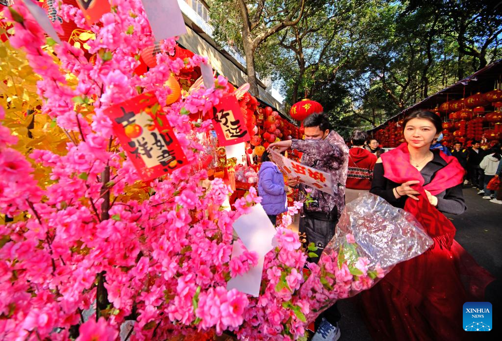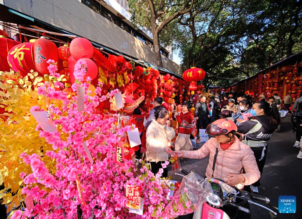 People shop for Chinese Lunar New Year decorations at a local fair in Nanning, south China's Guangxi Zhuang Autonomous Region, Jan. 12, 2025. (Xinhua/Zhou Hua)