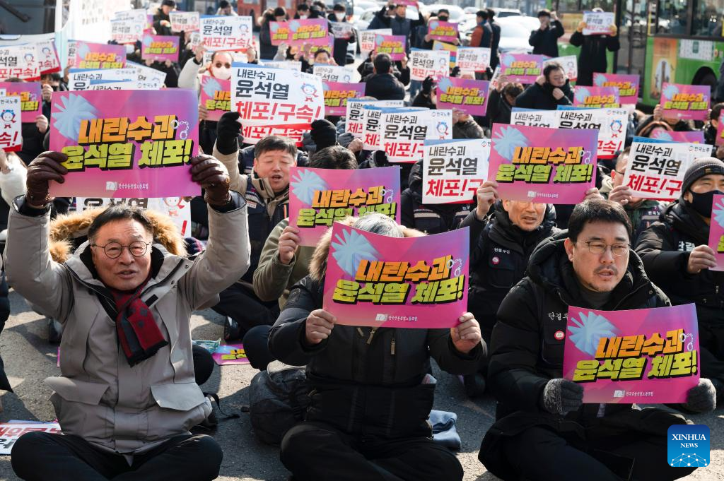 Protesters in favor of the impeachment of South Korean President Yoon Suk-yeol shout slogans "Immediate Arrest" during a rally near the presidential residence in Seoul, South Korea, Jan. 12, 2025. South Korean President Yoon Suk-yeol will not attend the first hearing of his impeachment trial, scheduled for Tuesday, for safety concerns, Yoon's defense counsel said Sunday. (Photo by Jun Hyosang/Xinhua)