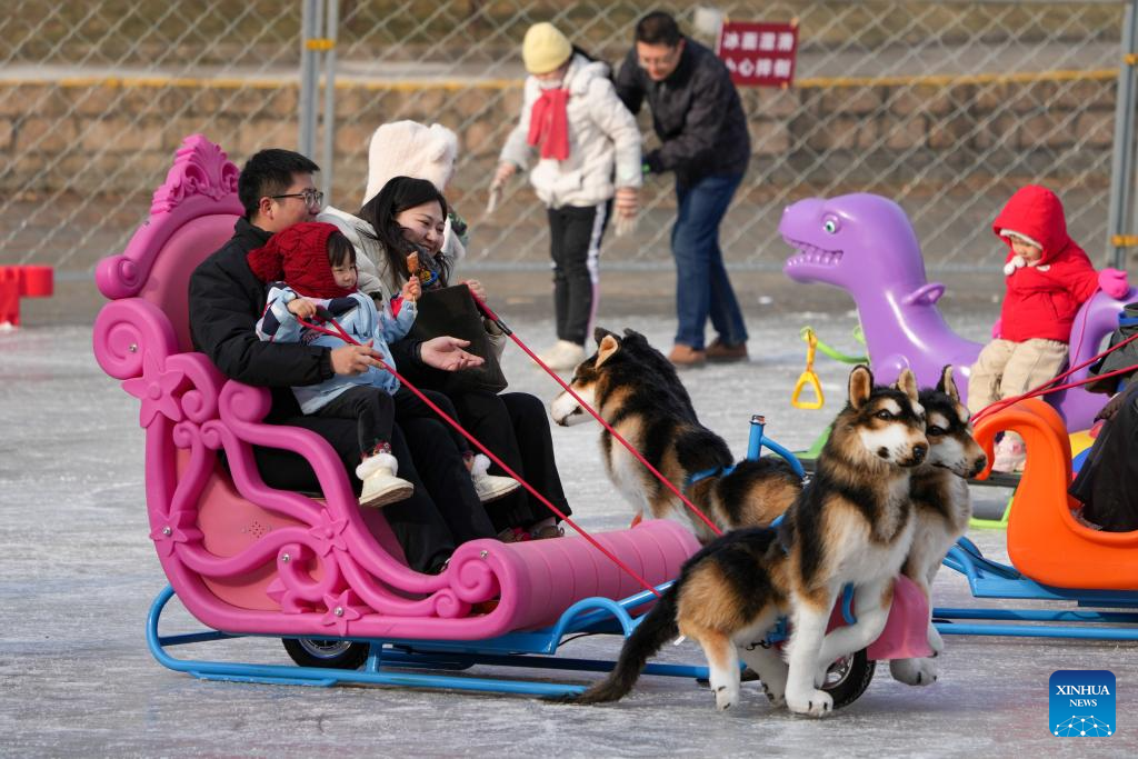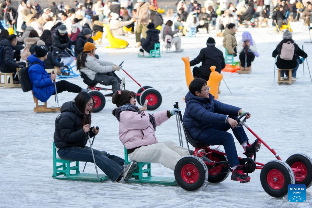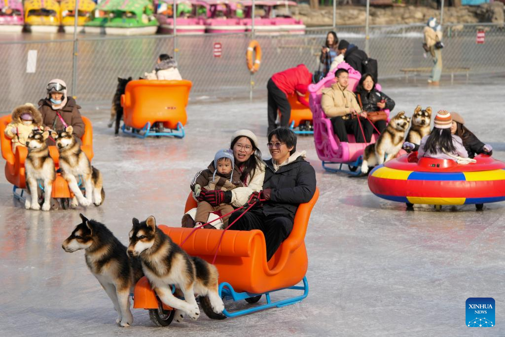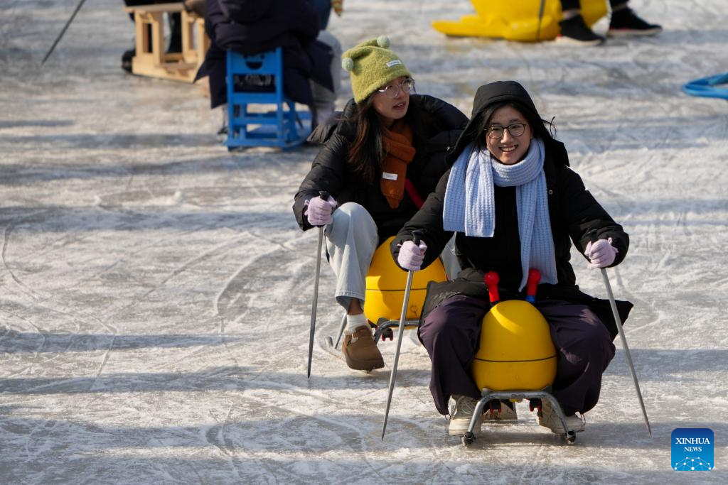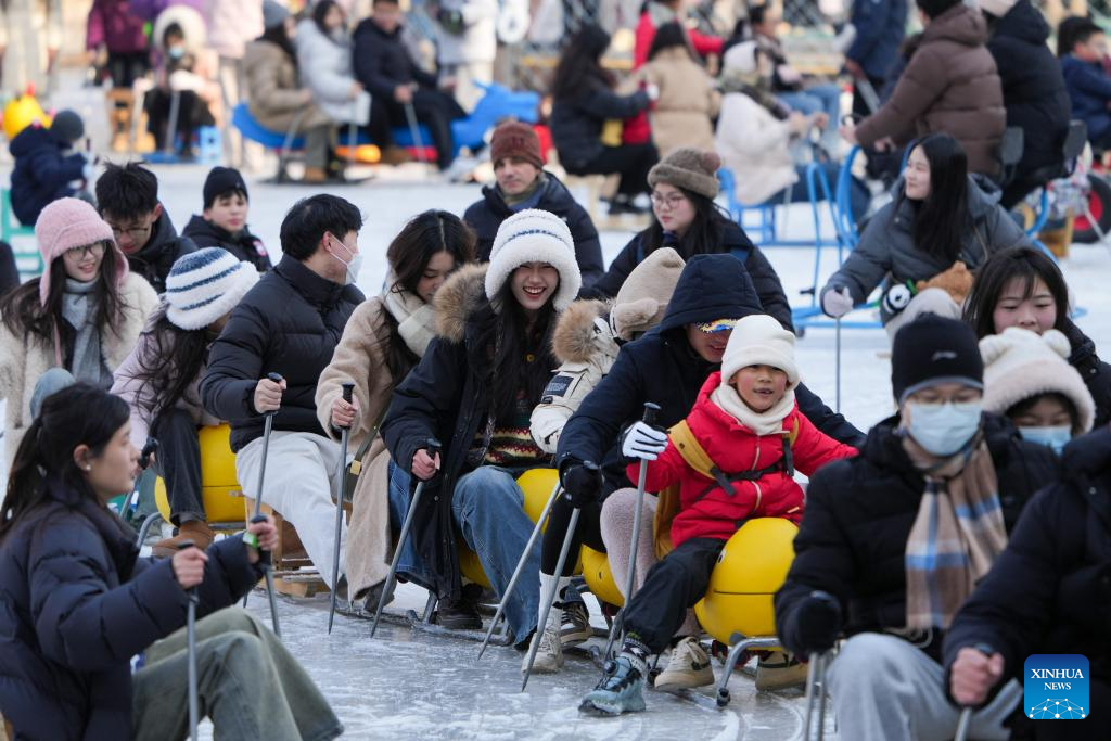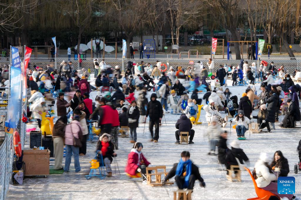 People enjoy themselves on the ice rink at Tuanjiehu Park in Beijing, capital of China, Jan. 11, 2025. Many ice rinks in Beijing's parks have opened recently, attracting lots of visitors. (Xinhua/Ju Huanzong)