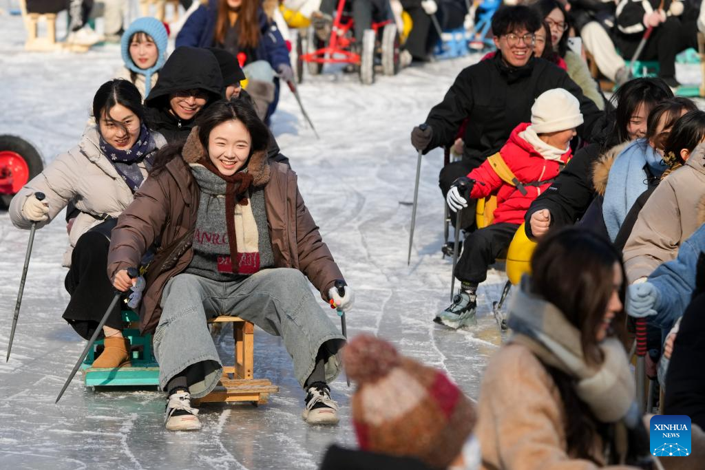 People have fun on ice rink at Tuanjiehu Park in Beijing