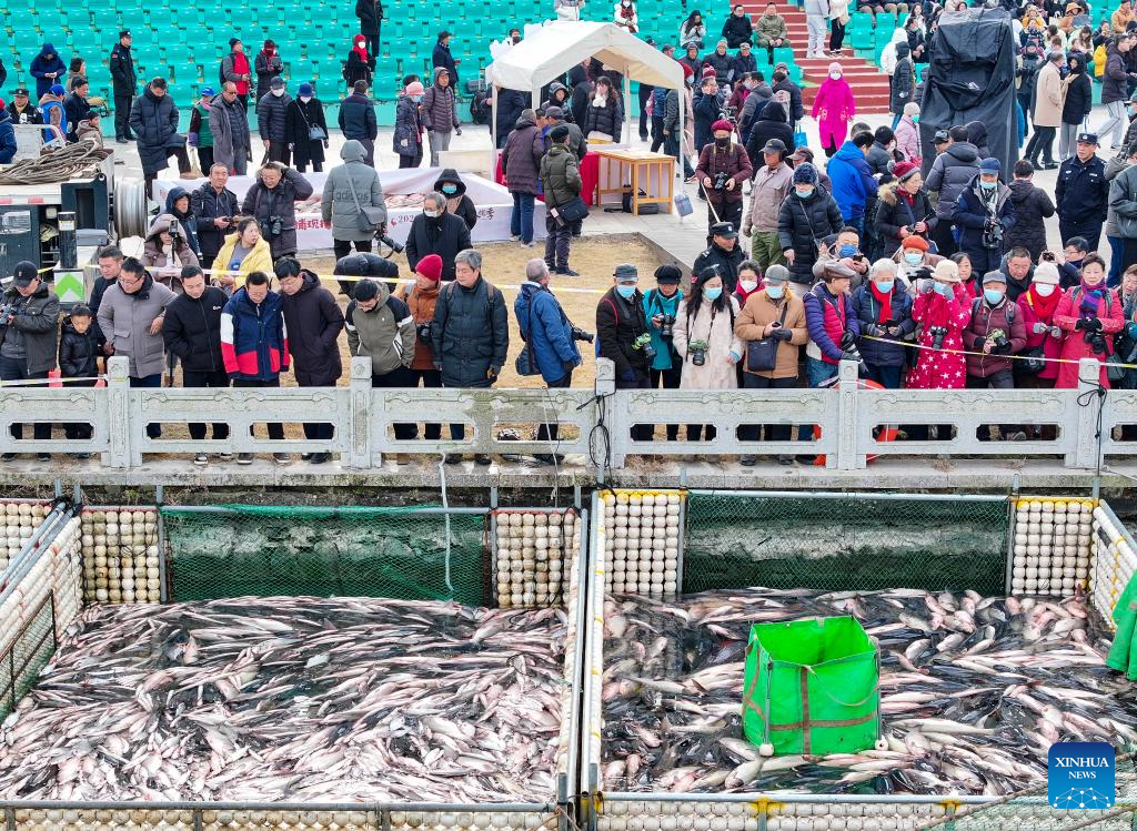 A drone photo shows people watching the freshly caught fish on the bank of Zhenhu Lake during a winter fishing festival in Jiangyan District of Taizhou, east China's Jiangsu Province, Jan. 11, 2025. The winter fishing festival opened at Zhenhu Lake in Jiangyan District of Taizhou on Saturday. (Photo by Gu Jihong/Xinhua)