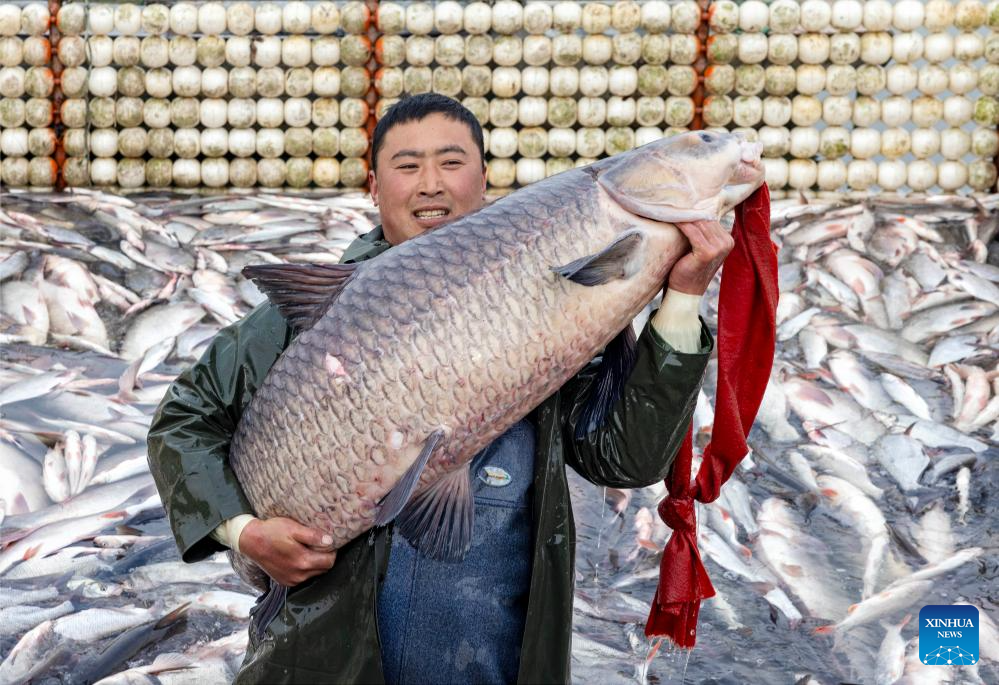 A fisherman shows the biggest fish caught in Zhenhu Lake during a winter fishing festival in Jiangyan District of Taizhou, east China's Jiangsu Province, Jan. 11, 2025. The winter fishing festival opened at Zhenhu Lake in Jiangyan District of Taizhou on Saturday. (Photo by Tang Dehong/Xinhua)