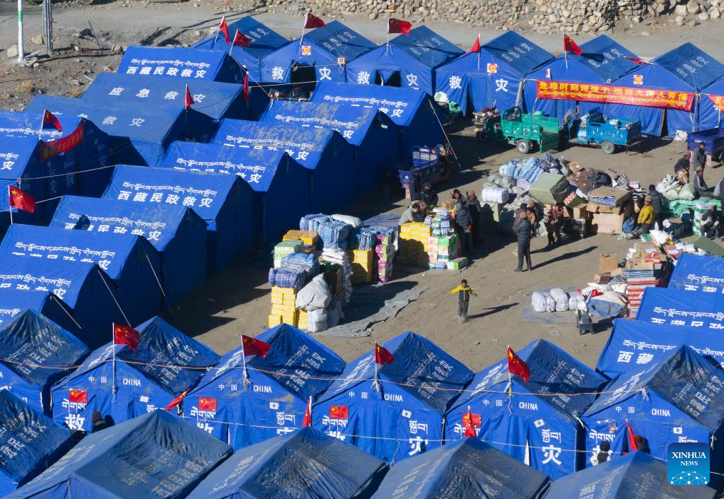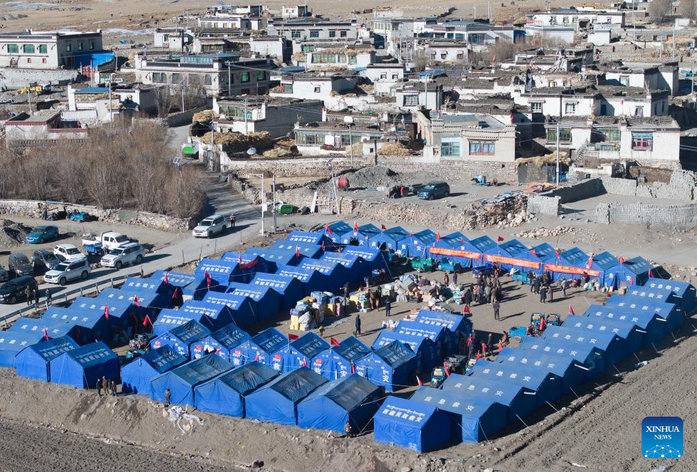 A drone photo taken on Jan. 11, 2025 shows a temporary resettlement site in Pucun Village of Sagya County in Xigaze City, southwest China's Xizang Autonomous Region. Water, food, fuel and other disaster relief materials have been delivered to the temporary resettlement site for the earthquake-affected residents of Pucun Village in Sagya County. Construction of prefabricated houses also began on Saturday afternoon. (Xinhua/Li Xiang)