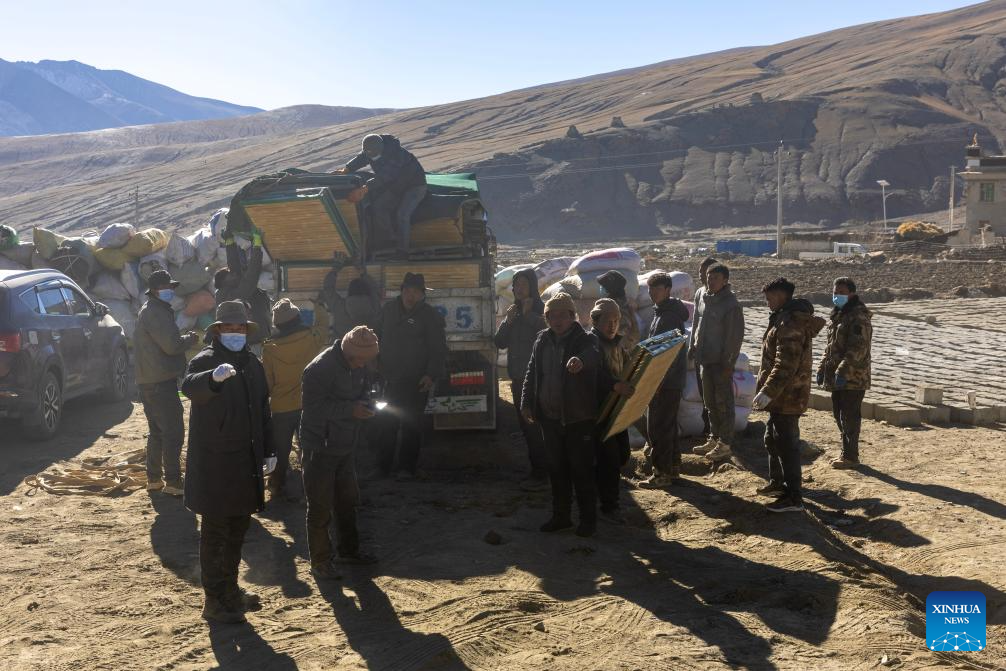 Earthquake-affected residents transfer disaster relief materials at a temporary resettlement site in Pucun Village of Sagya County in Xigaze City, southwest China's Xizang Autonomous Region, Jan. 11, 2025. Water, food, fuel and other disaster relief materials have been delivered to the temporary resettlement site for the earthquake-affected residents of Pucun Village in Sagya County. Construction of prefabricated houses also began on Saturday afternoon. (Xinhua/Bai Mingshan)