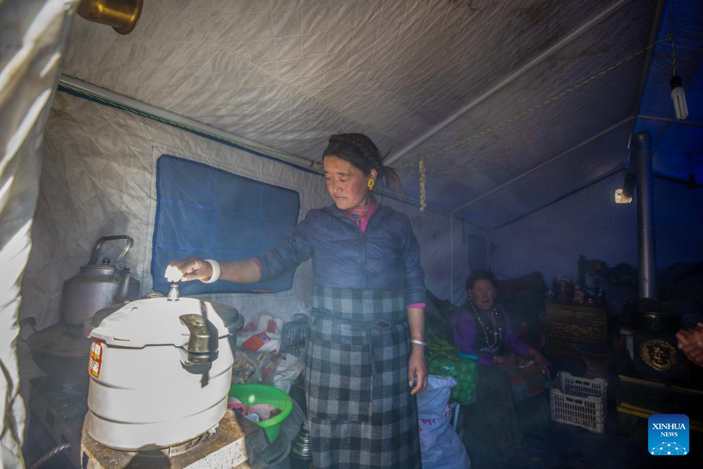 An earthquake-affected resident cooks inside a tent at a temporary resettlement site in Pucun Village of Sagya County in Xigaze City, southwest China's Xizang Autonomous Region, Jan. 11, 2025. Water, food, fuel and other disaster relief materials have been delivered to the temporary resettlement site for the earthquake-affected residents of Pucun Village in Sagya County. Construction of prefabricated houses also began on Saturday afternoon. (Xinhua/Jiang Fan)