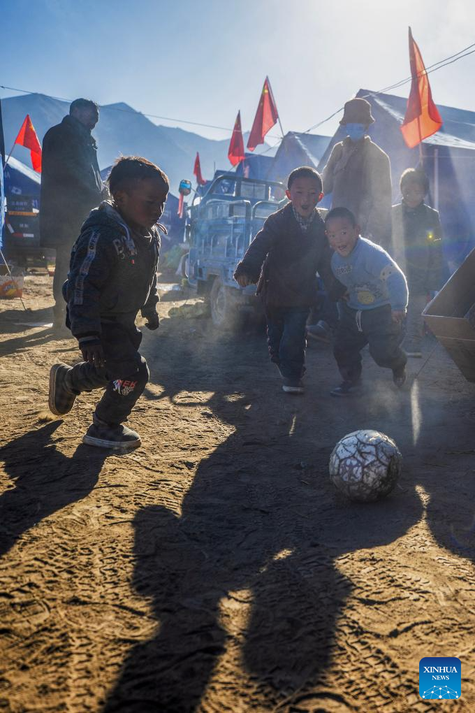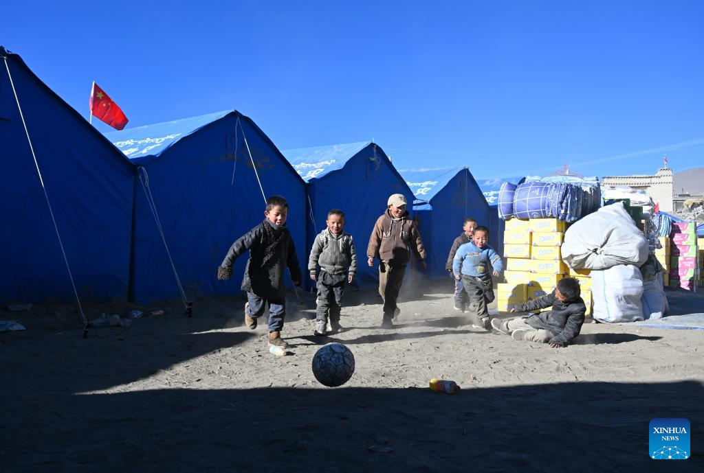 Children play at a temporary resettlement site in Pucun Village of Sagya County in Xigaze City, southwest China's Xizang Autonomous Region, Jan. 11, 2025. Water, food, fuel and other disaster relief materials have been delivered to the temporary resettlement site for the earthquake-affected residents of Pucun Village in Sagya County. Construction of prefabricated houses also began on Saturday afternoon. (Xinhua/Jiang Fan)