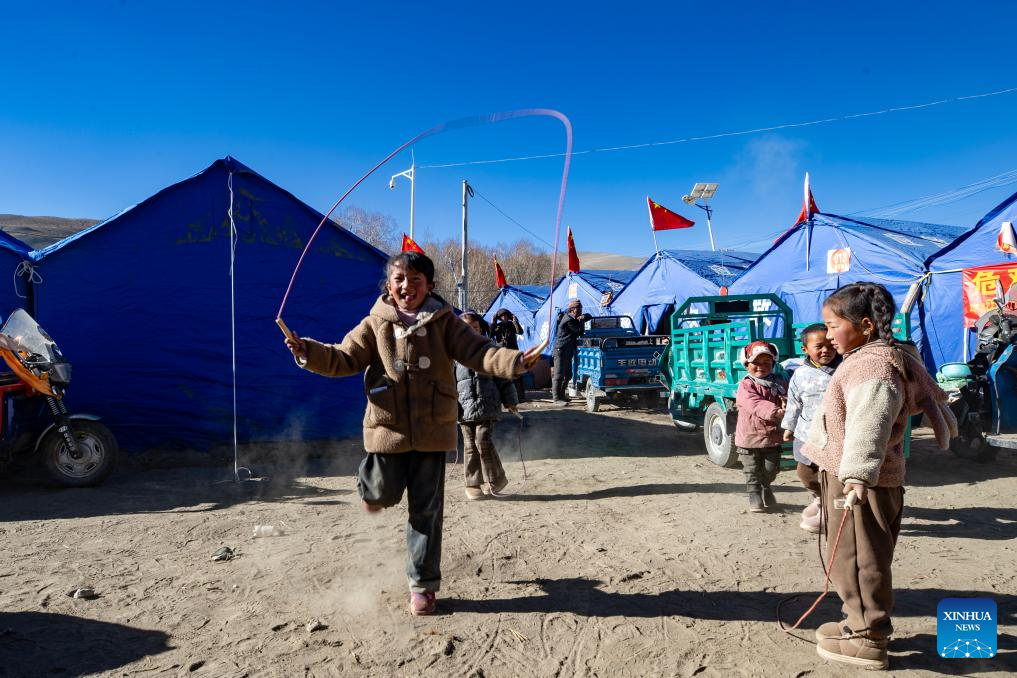 Children play at a temporary resettlement site in Pucun Village of Sagya County in Xigaze City, southwest China's Xizang Autonomous Region, Jan. 11, 2025. Water, food, fuel and other disaster relief materials have been delivered to the temporary resettlement site for the earthquake-affected residents of Pucun Village in Sagya County. Construction of prefabricated houses also began on Saturday afternoon. (Xinhua/Li Xiang)