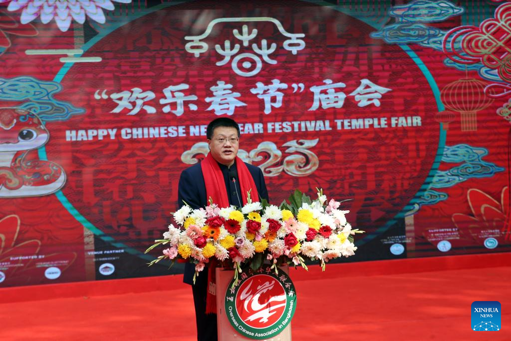 Chinese Ambassador to Bangladesh Yao Wen delivers a speech during a temple fair welcoming the Chinese New Year in Dhaka, Bangladesh, Jan. 10, 2025. As the Chinese zodiac Year of the Snake is approaching, the Ministry of Culture and Tourism of China and the Chinese Embassy in Bangladesh jointly hosted the "Happy Chinese New Year Festival" Temple Fair here on Friday. Thousands of people from all walks of life in Bangladesh gathered together to welcome the upcoming Spring Festival and experience Chinese culture. (Photo by Habibur Rahman/Xinhua)