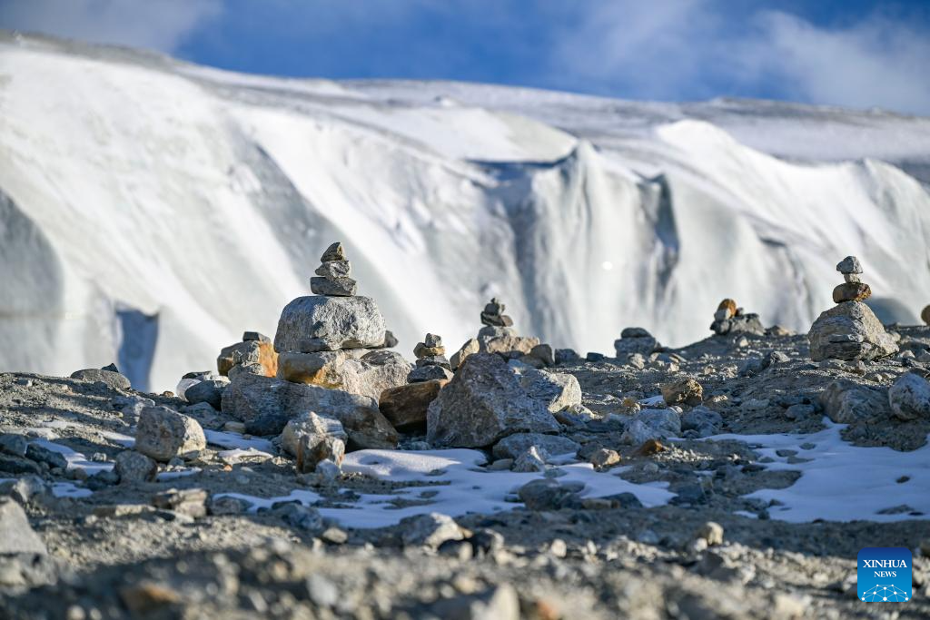 Stacks of stones in a bid for blessings are pictured in the Muztagata glacier park, Taxkorgan Tajik Autonomous County, northwest China's Xinjiang Uygur Autonomous Region, Jan. 12, 2025. (Xinhua/Chen Shuo)