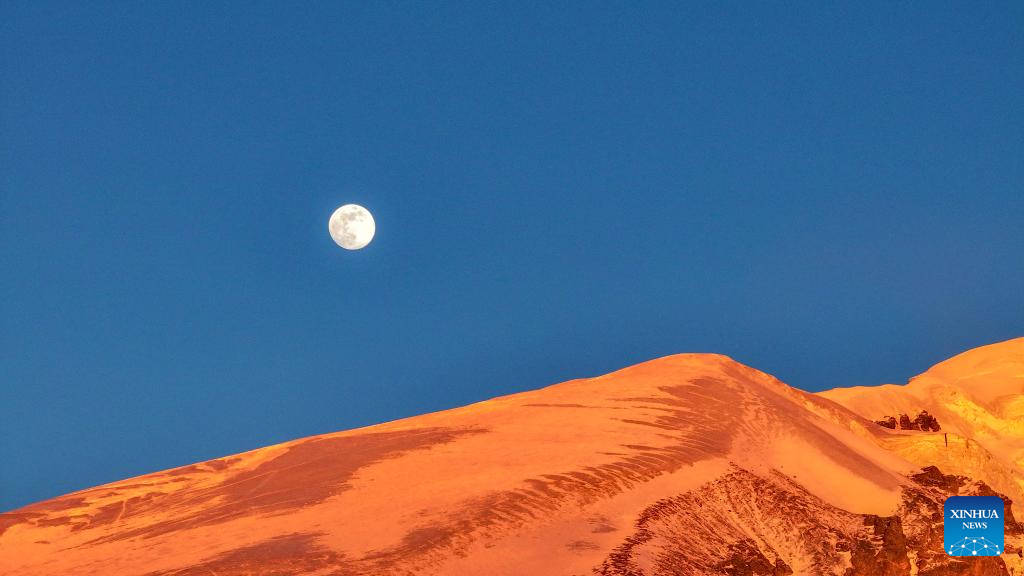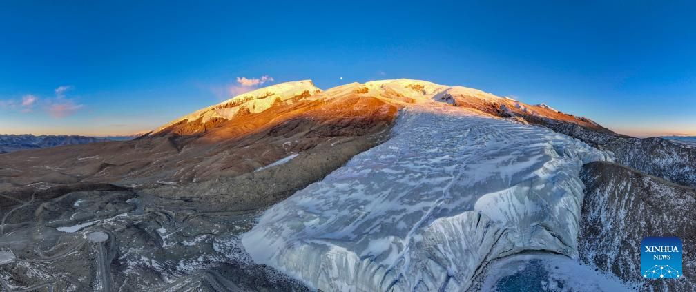 A drone photo taken on Jan. 12, 2025 shows a view of Mount Muztagata at sunset in northwest China's Xinjiang Uygur Autonomous Region. (Xinhua/Chen Shuo)