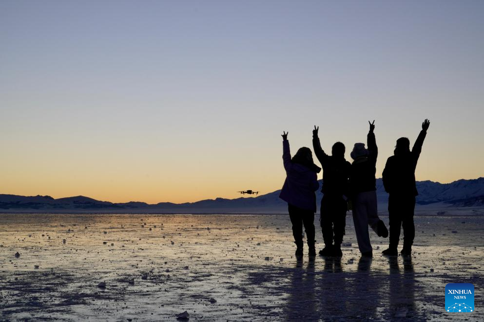 Tourists take photos with a drone on the frozen surface of Sayram Lake at sunset in Bortala Mongolian Autonomous Prefecture, northwest China's Xinjiang Uygur Autonomous Region, Jan. 13, 2025. Sayram Lake is the largest and highest alpine lake in Xinjiang. (Xinhua/Du Juanjuan)