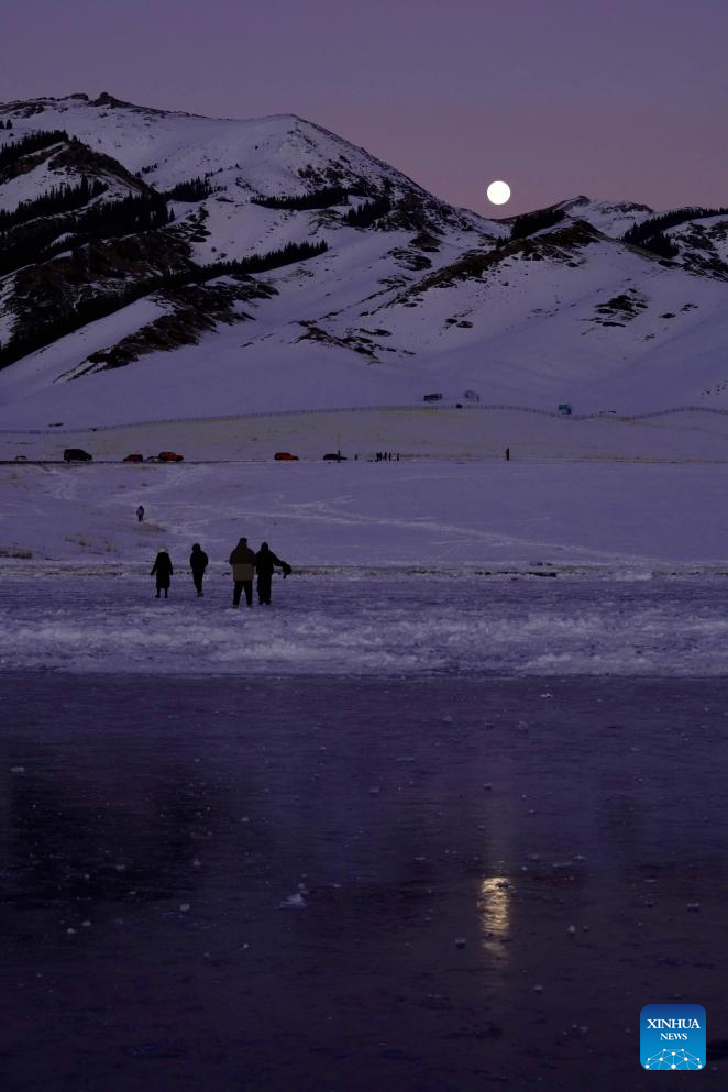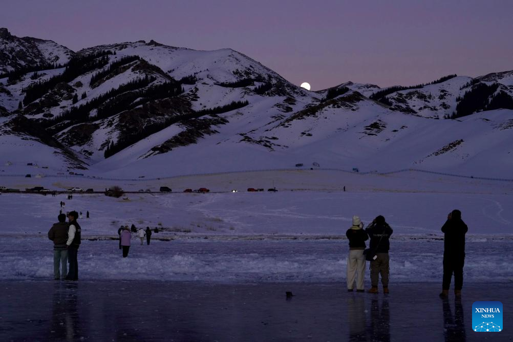 Tourists take photos of the moon on the frozen surface of Sayram Lake in Bortala Mongolian Autonomous Prefecture, northwest China's Xinjiang Uygur Autonomous Region, Jan. 13, 2025. Sayram Lake is the largest and highest alpine lake in Xinjiang. (Xinhua/Du Juanjuan)
