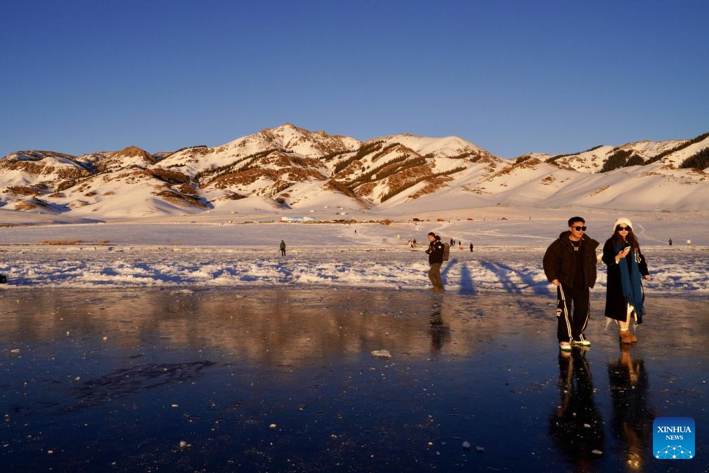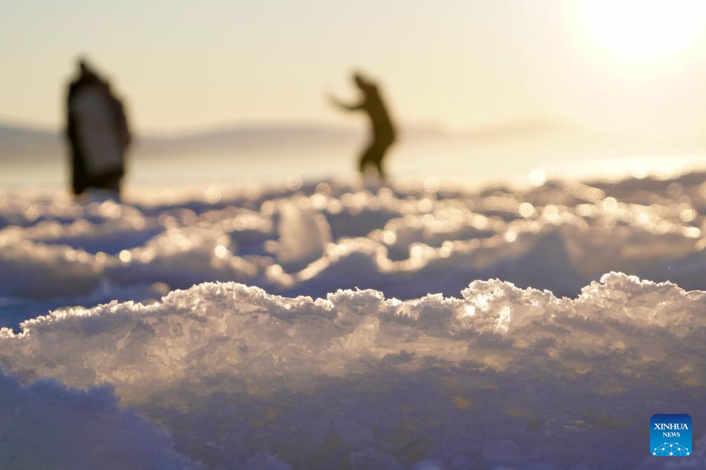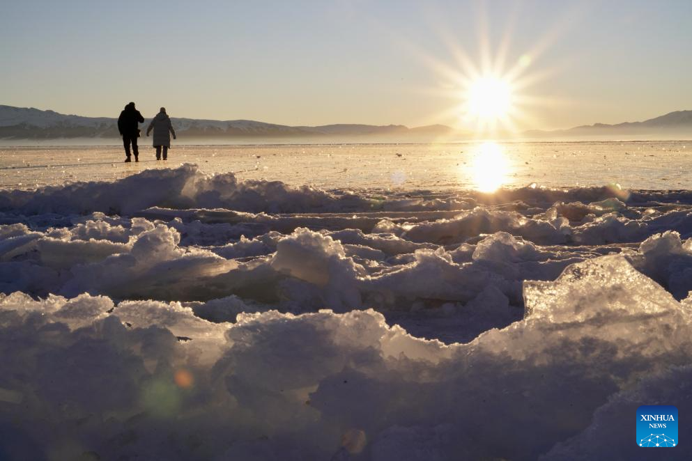 Tourists walk on the frozen surface of Sayram Lake at sunset in Bortala Mongolian Autonomous Prefecture, northwest China's Xinjiang Uygur Autonomous Region, Jan. 13, 2025. Sayram Lake is the largest and highest alpine lake in Xinjiang. (Xinhua/Du Juanjuan)