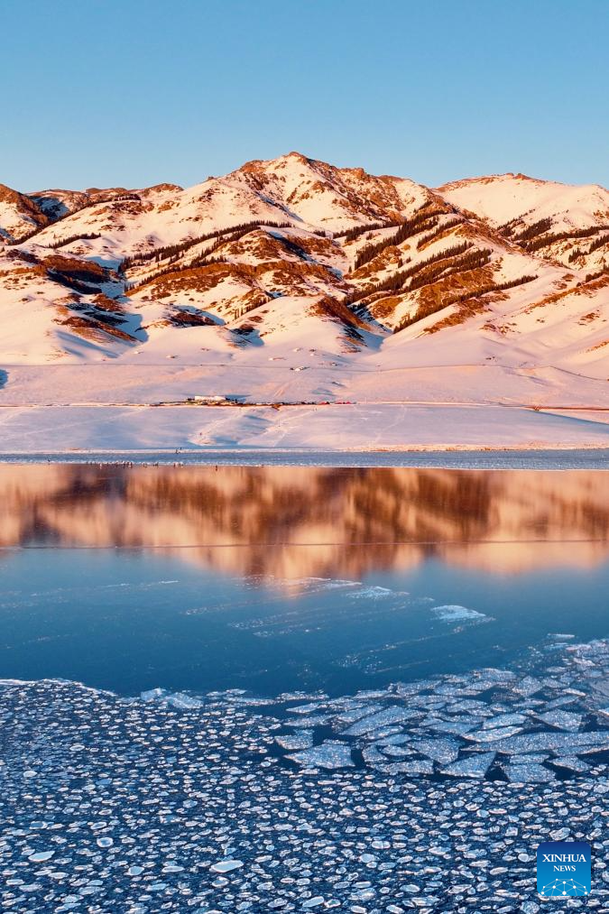 A drone photo taken on Jan. 13, 2025 shows a view of Sayram Lake at sunset in Bortala Mongolian Autonomous Prefecture, northwest China's Xinjiang Uygur Autonomous Region. Sayram Lake is the largest and highest alpine lake in Xinjiang. (Xinhua/Du Juanjuan)