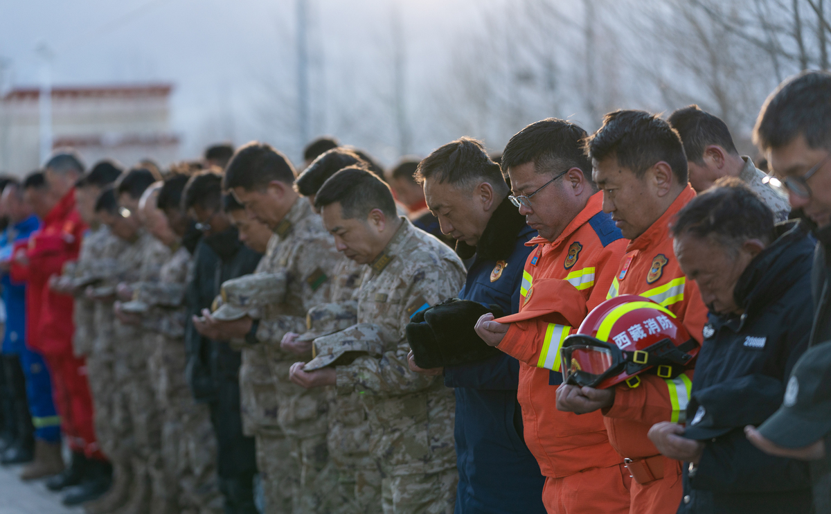 People pay a three-minute silent tribute to people who perished in the earthquake in a memorial service in Dingri county, Xizang, on Monday. (Tenzin Nyida/Xinhua)