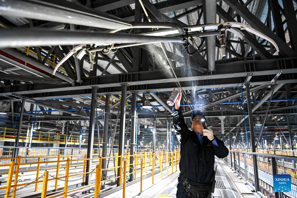 A staff member examines a bullet train at a maintenance base in Kunming, southwest China's Yunnan Province, Jan. 13, 2025. The Spring Festival travel rush of this year started on Tuesday. Staff members at the maintenance bases of the country's railway operators are busy servicing trains to ensure their normal operations during the travel rush. (Photo by Peng Yikai/Xinhua)