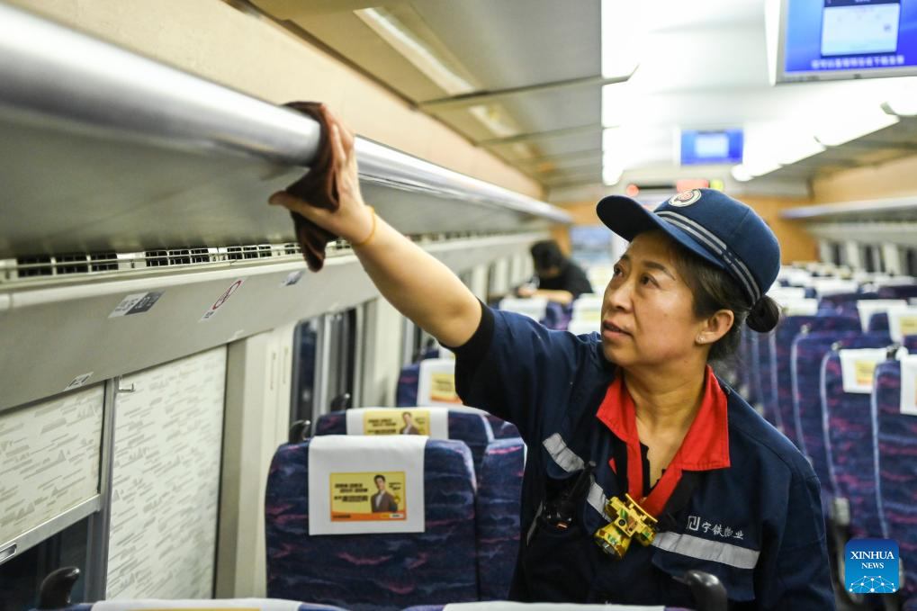 A sanitation worker cleans a bullet train at a maintenance base in Nanning, south China's Guangxi Zhuang Autonomous Region, Jan. 14, 2025. The Spring Festival travel rush of this year started on Tuesday. Staff members at the maintenance bases of the country's railway operators are busy servicing trains to ensure their normal operations during the travel rush. (Xinhua/Cao Yiming)