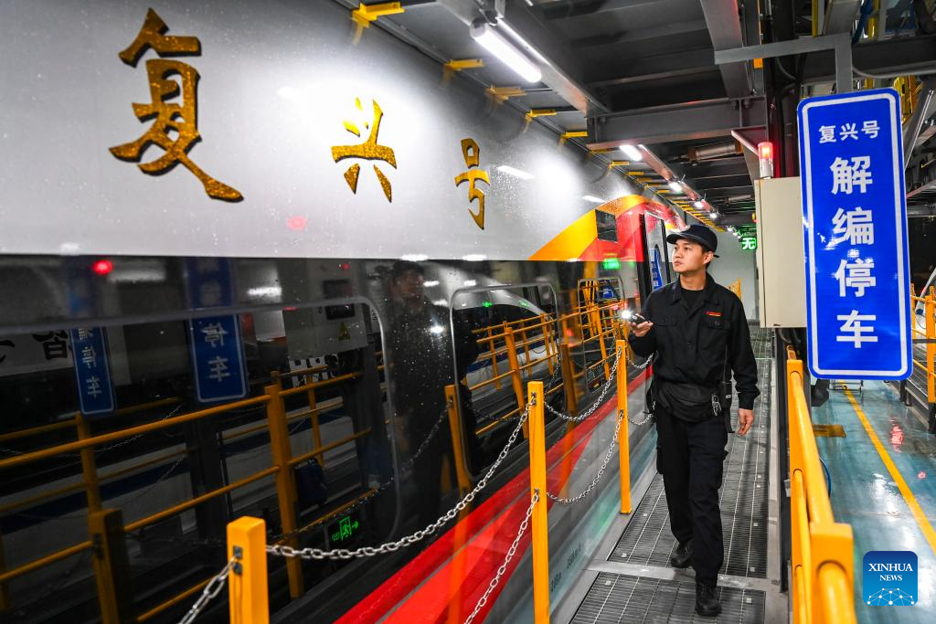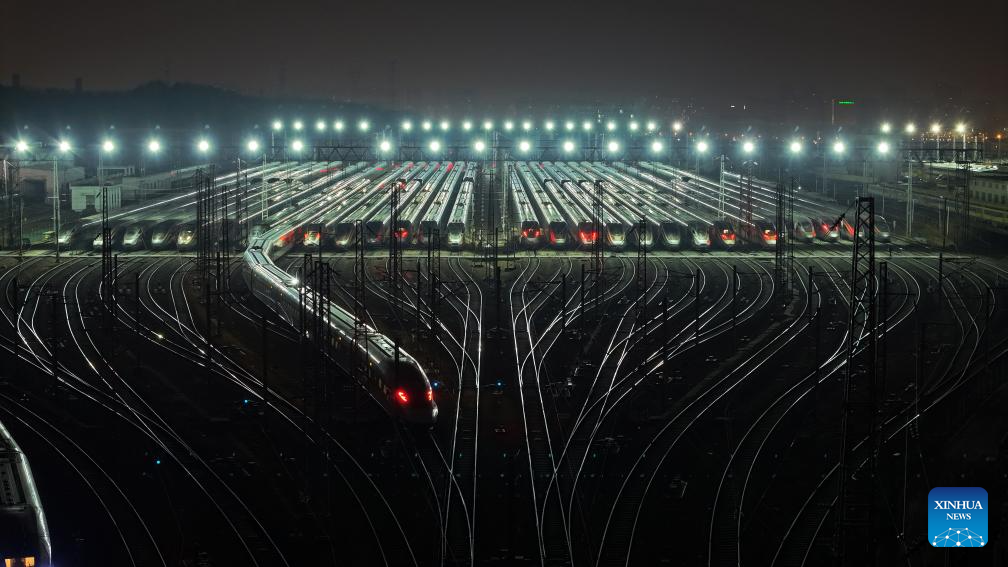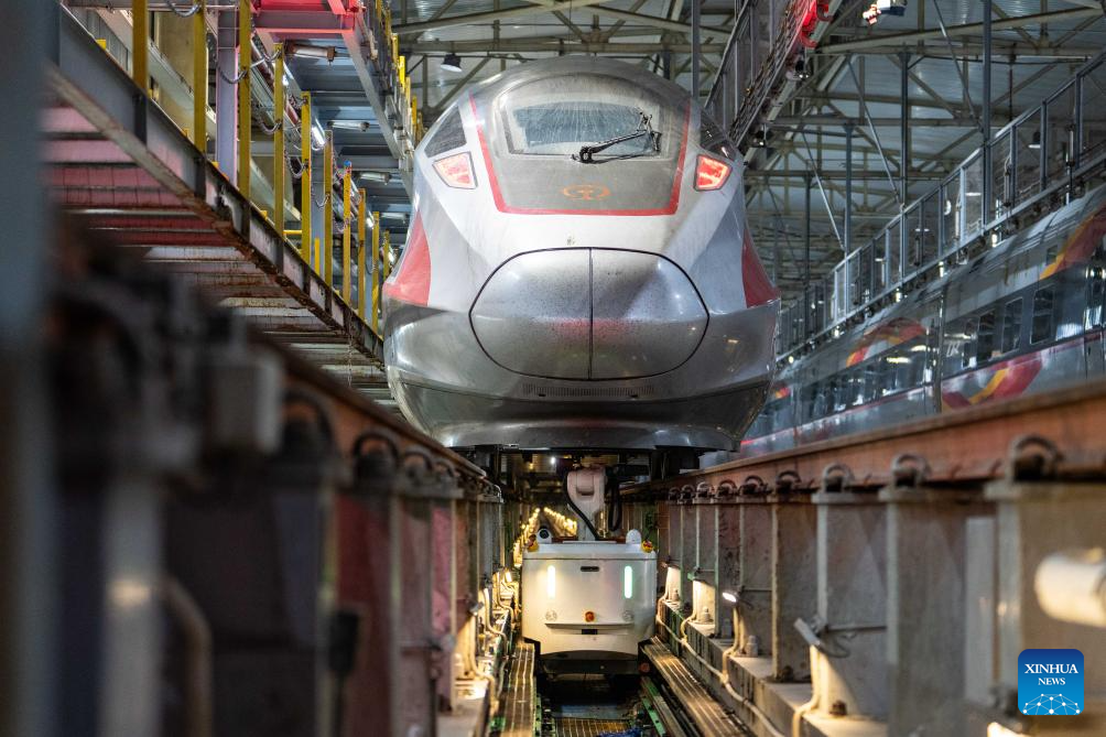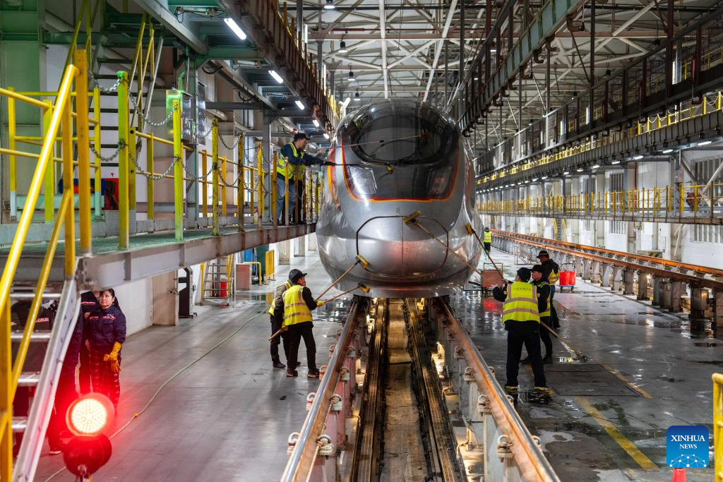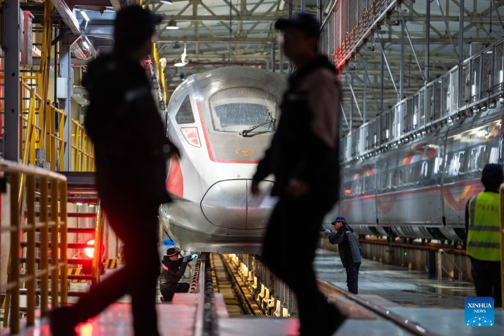 Staff members examine bullet trains at a maintenance base in Changsha, central China's Hunan Province, Jan. 14, 2025. The Spring Festival travel rush of this year started on Tuesday. Staff members at the maintenance bases of the country's railway operators are busy servicing trains to ensure their normal operations during the travel rush. (Xinhua/Chen Sihan)