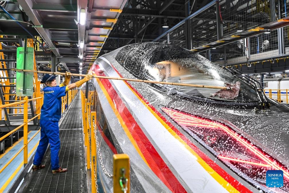 Staff members clean a bullet train at a maintenance base in Changsha, central China's Hunan Province, Jan. 14, 2025. The Spring Festival travel rush of this year started on Tuesday. Staff members at the maintenance bases of the country's railway operators are busy servicing trains to ensure their normal operations during the travel rush. (Xinhua/Chen Sihan)