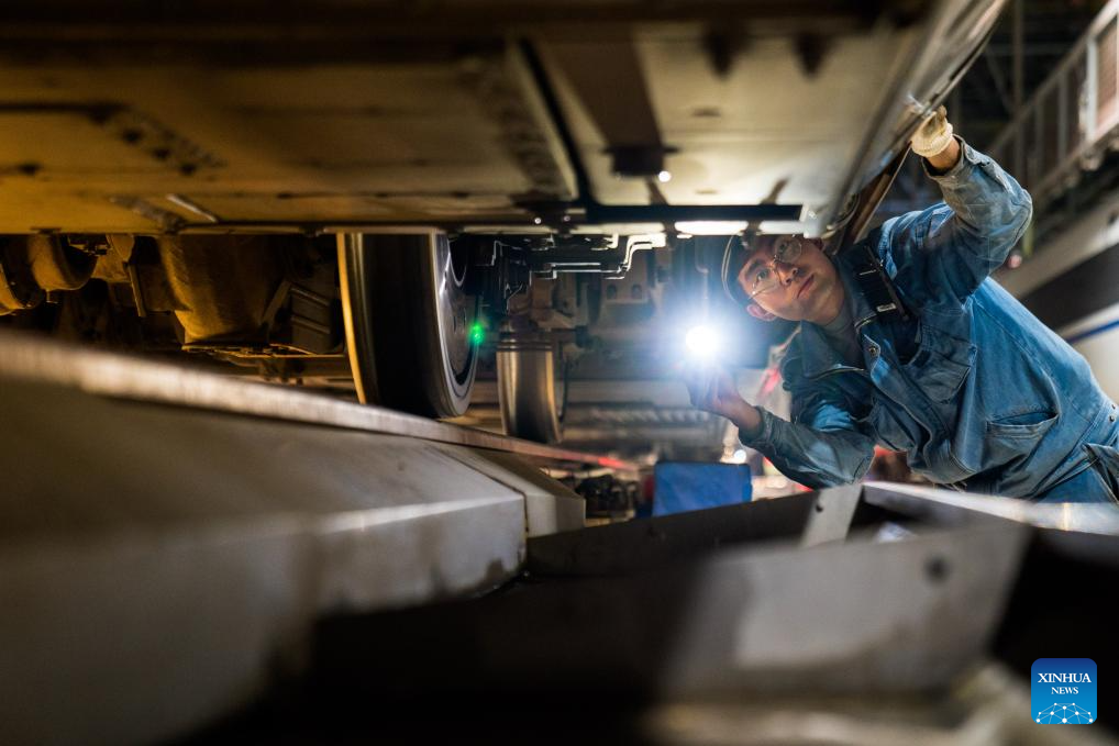 A staff member examines a bullet train at a maintenance base in Nanning, south China's Guangxi Zhuang Autonomous Region, Jan. 14, 2025. The Spring Festival travel rush of this year started on Tuesday. Staff members at the maintenance bases of the country's railway operators are busy servicing trains to ensure their normal operations during the travel rush. (Xinhua/Cao Yiming)