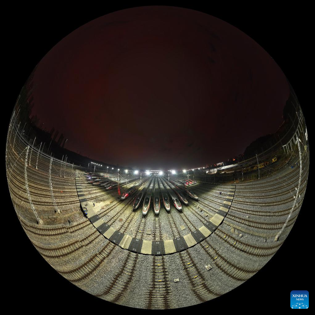 An aerial panoramic drone photo taken on Jan. 14, 2025 shows bullet trains at a maintenance base in Changsha, central China's Hunan Province. The Spring Festival travel rush of this year started on Tuesday. Staff members at the maintenance bases of the country's railway operators are busy servicing trains to ensure their normal operations during the travel rush. (Xinhua/Chen Zhenhai)