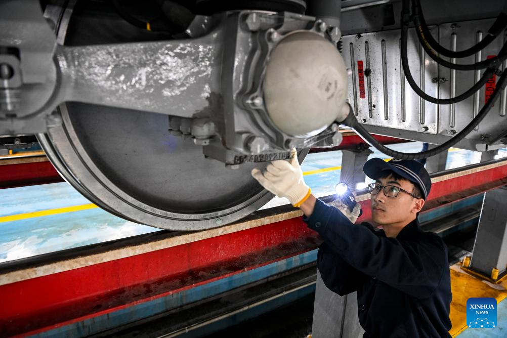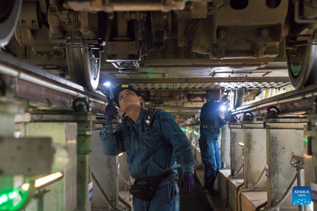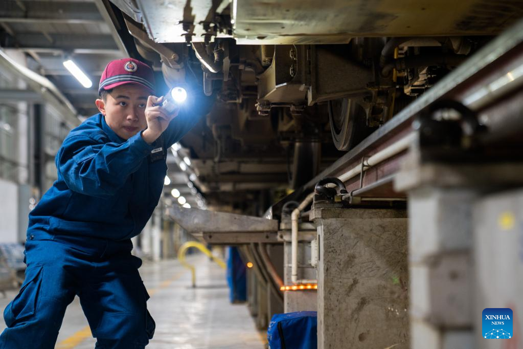 Staff members examine a train at a maintenance base in Kunming, southwest China's Yunnan Province, Jan. 13, 2025. The Spring Festival travel rush of this year started on Tuesday. Staff members at the maintenance bases of the country's railway operators are busy servicing trains to ensure their normal operations during the travel rush. (Photo by Peng Yikai/Xinhua)